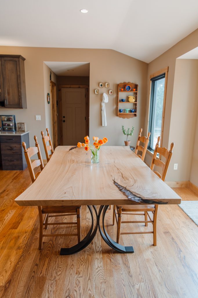 Live edge Hackberry community table at CSU harvested from a tree that grew on the property